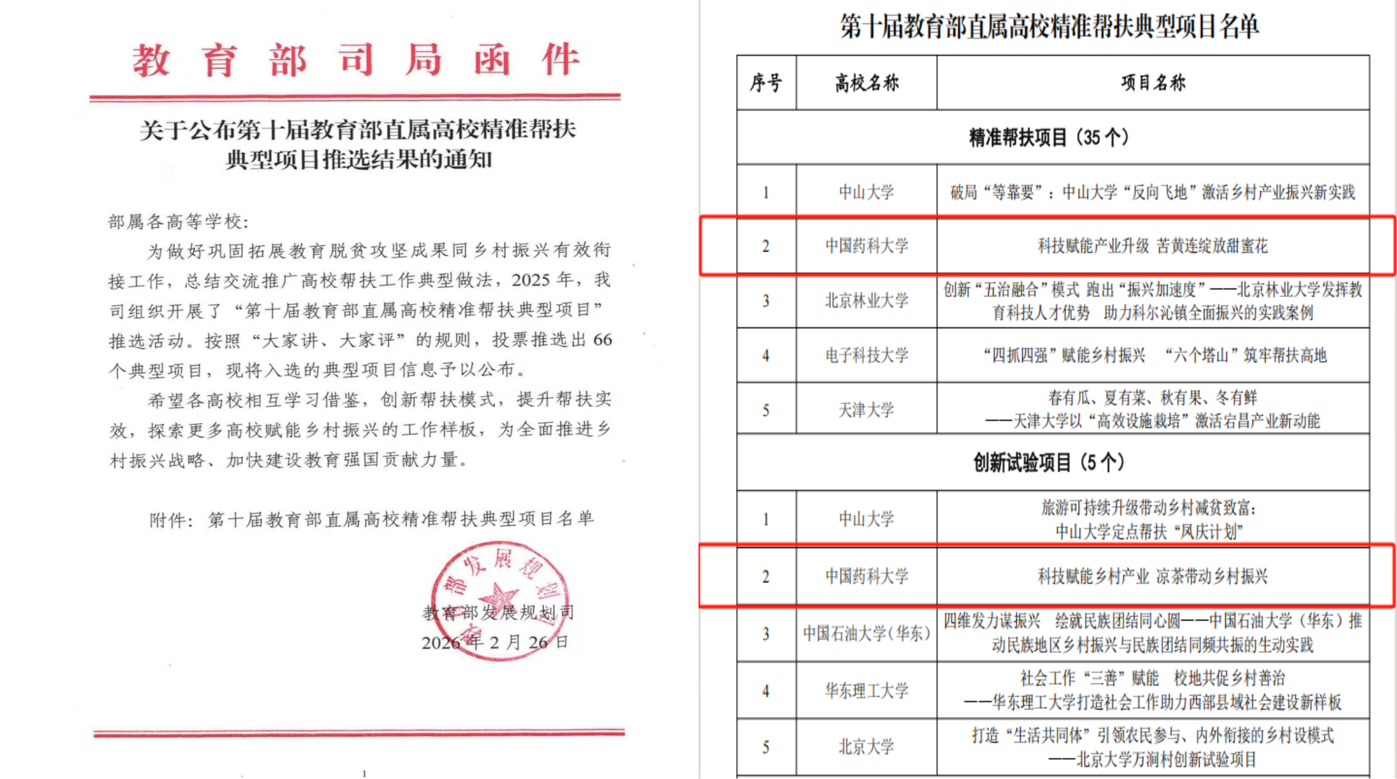 近日,第十届教育部直属高校精准帮扶典型项目推选结果正式公布,我校申报的《科技赋能产业升级 苦黄连绽放甜蜜花》在精准帮扶典型项目中位列第二;我校中药学院申报的《科技赋能乡村产业 凉茶带动乡村振兴》在创新试验项目中位列第二。我校已连续10次,累计12个项目成功入选教育部直属高校精准帮扶典型项目,是教育部直属高校中入选次数最多、入选项目最多的高校。